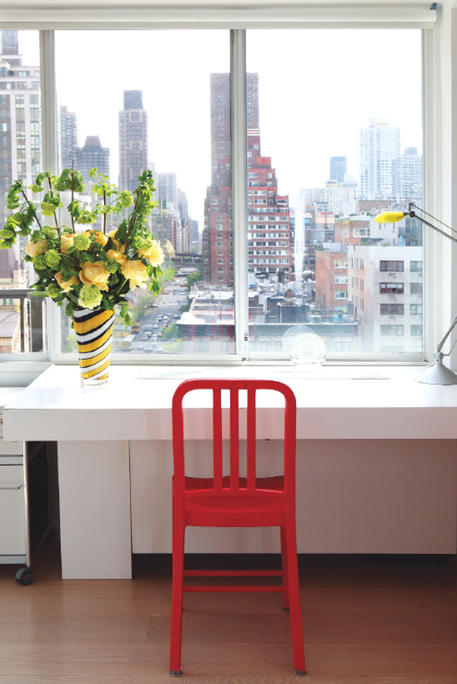Dupire designed the desk; the red chair is from Design Within Reach.
