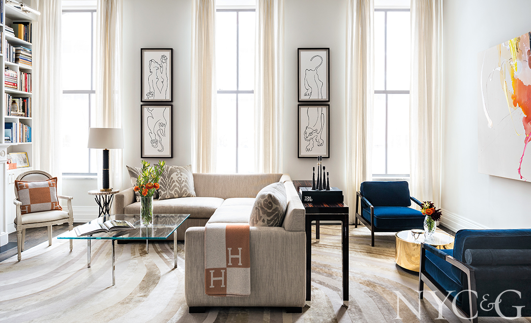 In the living room, an Avery Boardman sectional upholstered in Holland & Sherry’s Avalon in Mollusk, a Mies van der Rohe Barcelona cocktail table, and Fendi Casa armchairs sit atop a Paul Smith–designed Pale Swirl rug for the Rug Company. The ink panther drawings are by Marilu Nordenflycht.