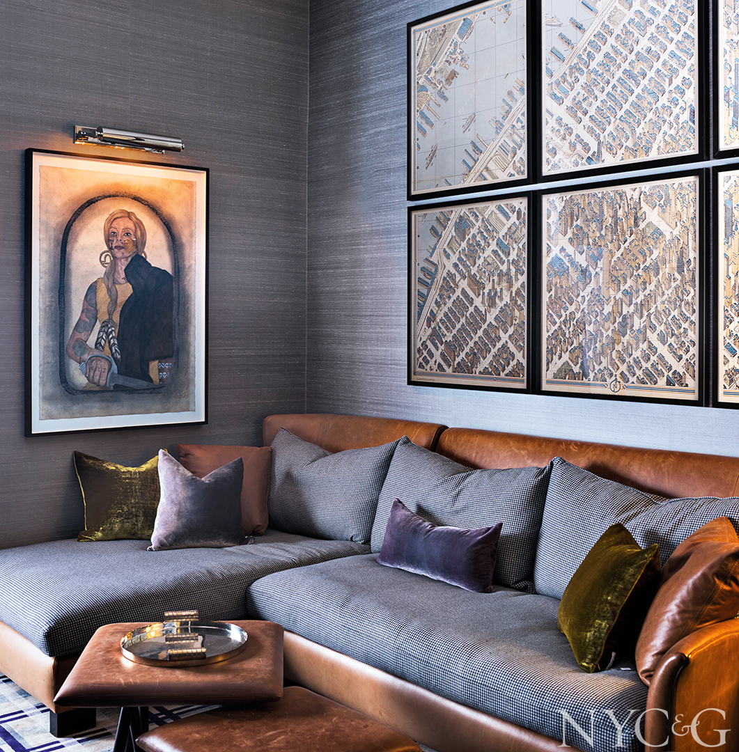 In the den/media room, maps of Manhattan and Frohawk Two Feathers‘ Ineke hang above a Montauk Sofa sectional upholstered in Ralph Lauren Home’s Warrendale Houndstooth.
