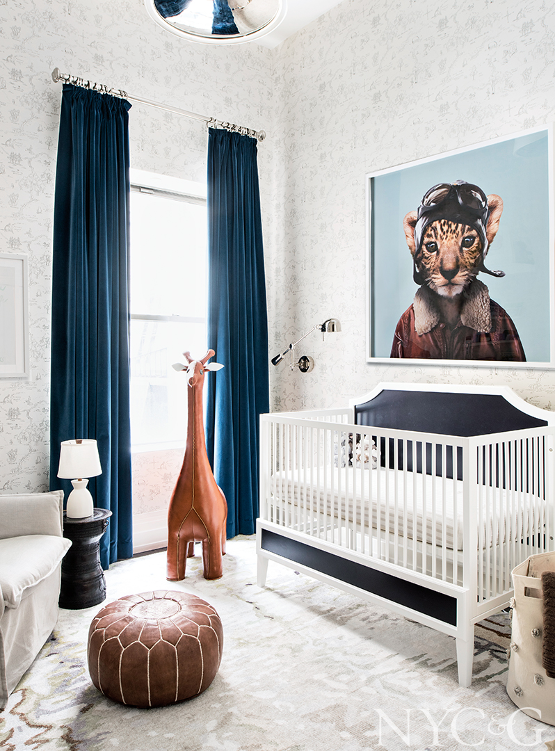 The son’s bedroom includes a Litchfield crib from DucDuc, an AllModern pouf, and Yago Partal’s Jeong the Leopard.