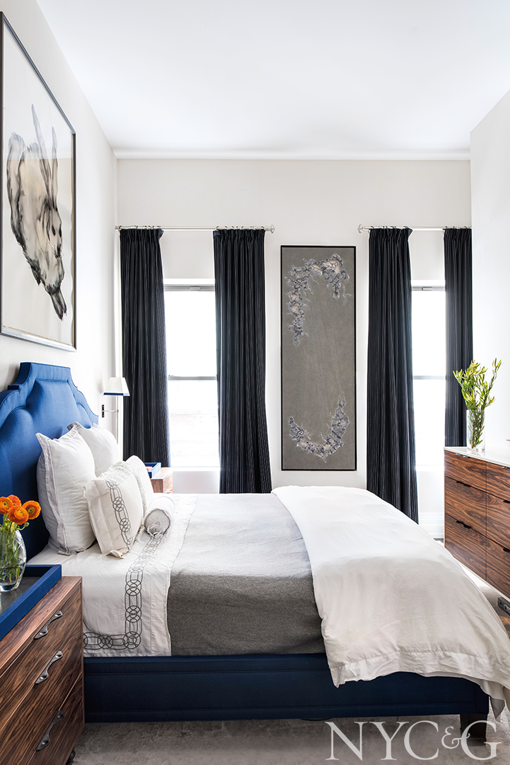 The Hickory Chair headboard in the master bedroom is upholstered in Holland & Sherry’s wool Militaire in Navy; the sconce is from the Urban Electric Co.