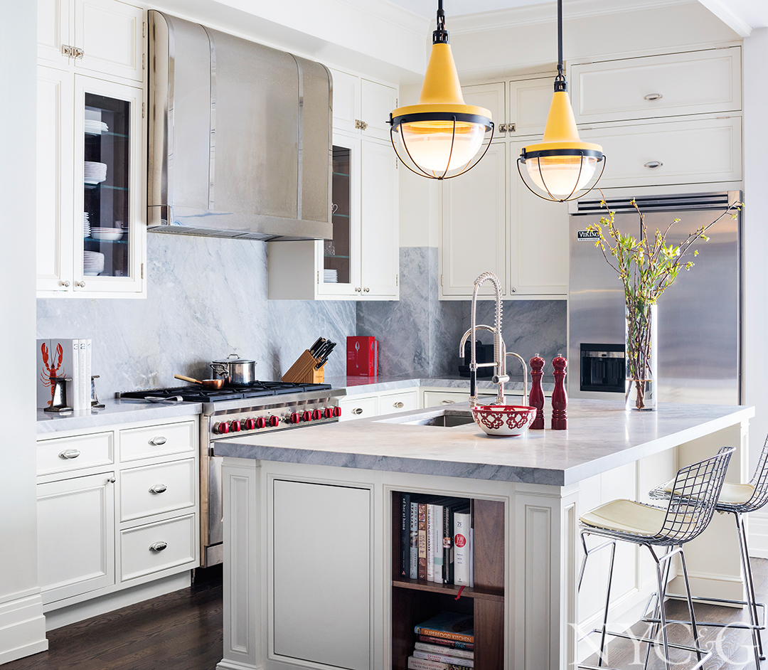 Malplaquet pendant lights from the Urban Electric Co. hang above the kitchen island; the faucet is from Dornbracht and the custom hood is by RangeCraft.