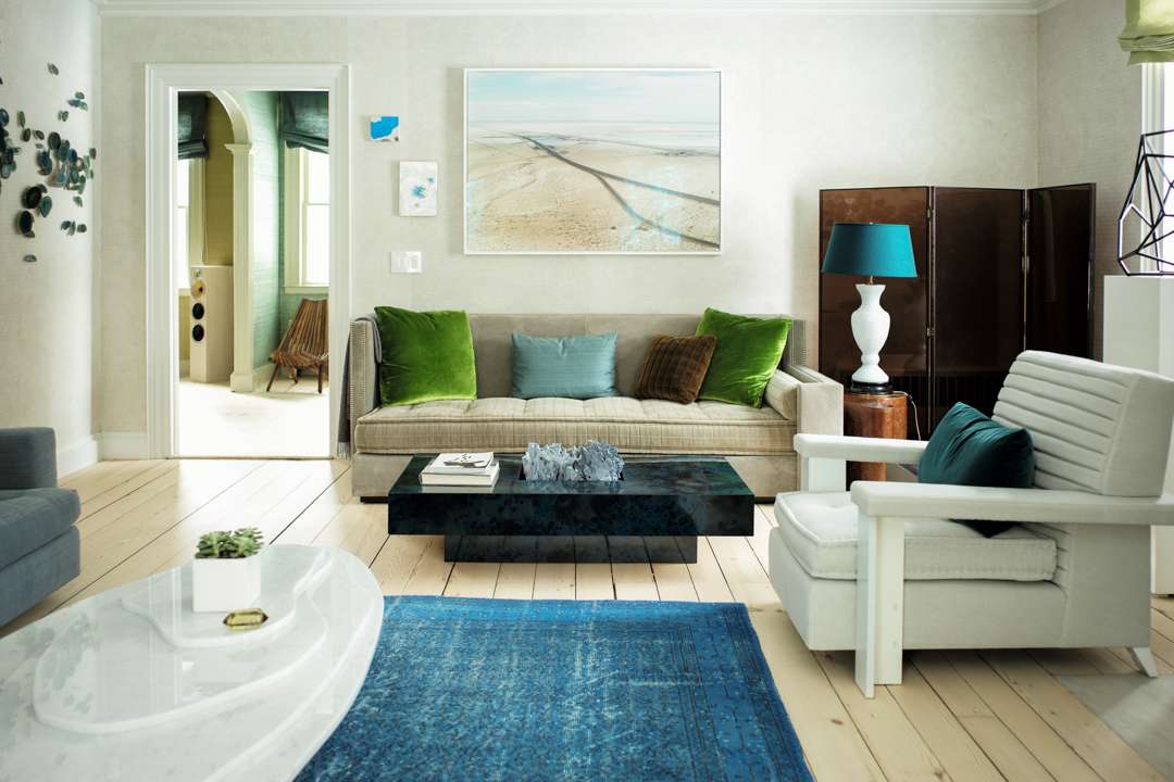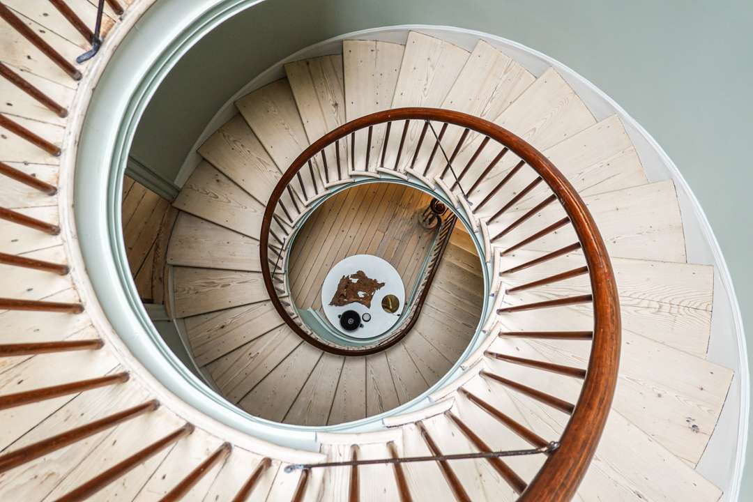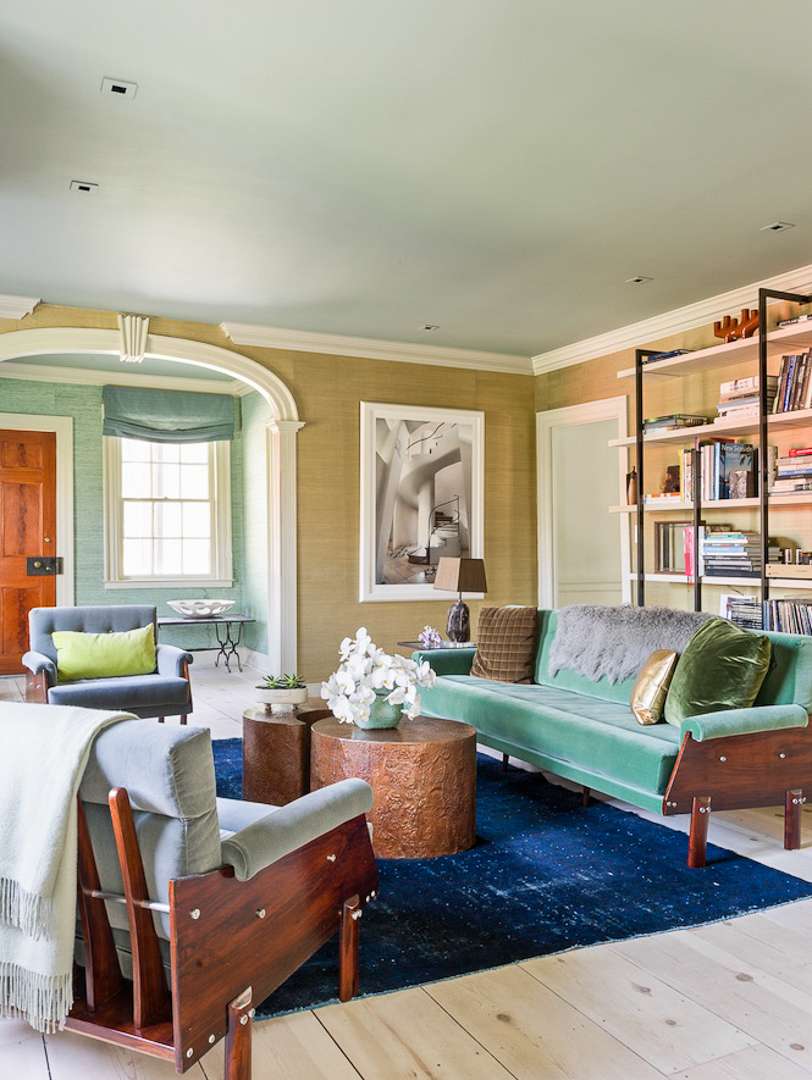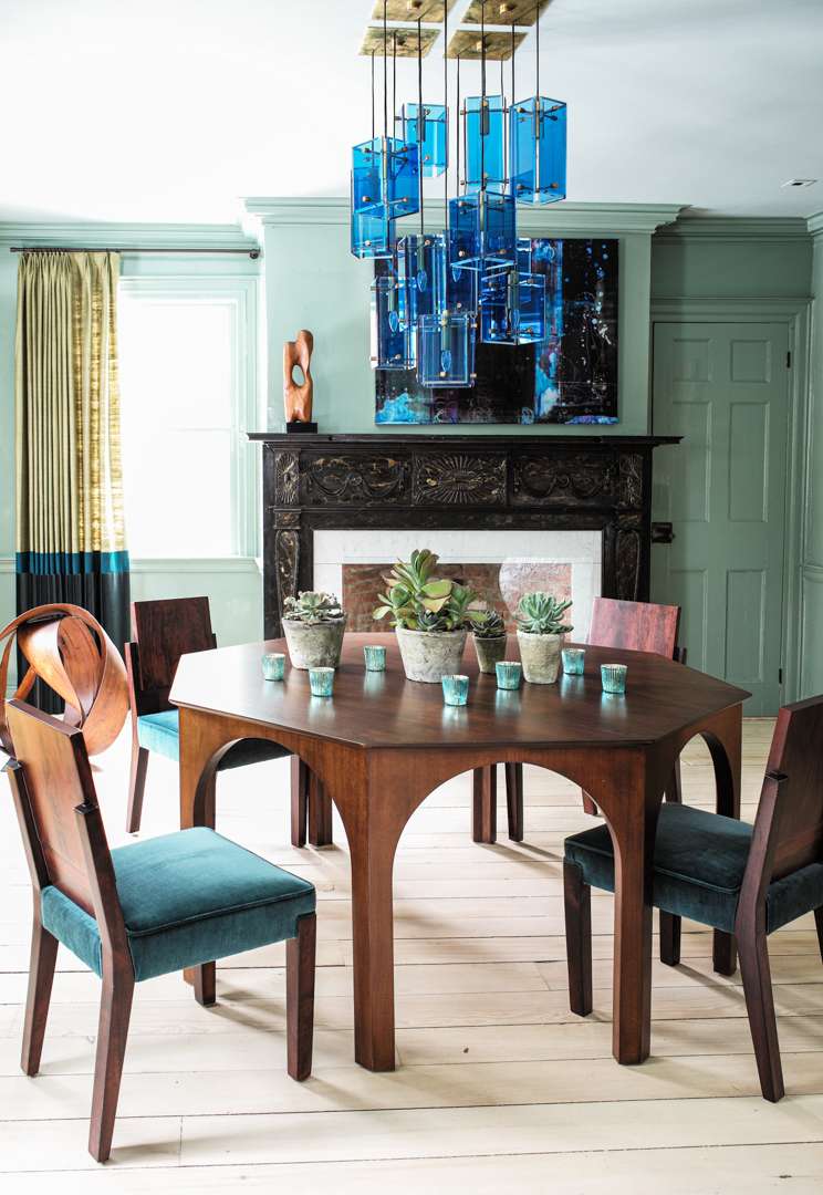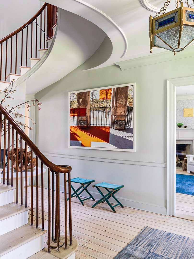Colorful hues fill the 4,100-square-foot home, which is outfitted with new bathrooms and a new kitchen (complete with a blue La Cornue range). Textured wall coverings, lacquered paint, leather floor tiles further the abode’s elegant yet playful and artistic panache. Of course, historic charm is palpable with details like the intricate trim on the exterior, the seven hand-carved mantels, and the graceful two-and-a-half-story floating staircase, which Roop says “would have to top the list” as his favorite design feature in the house.