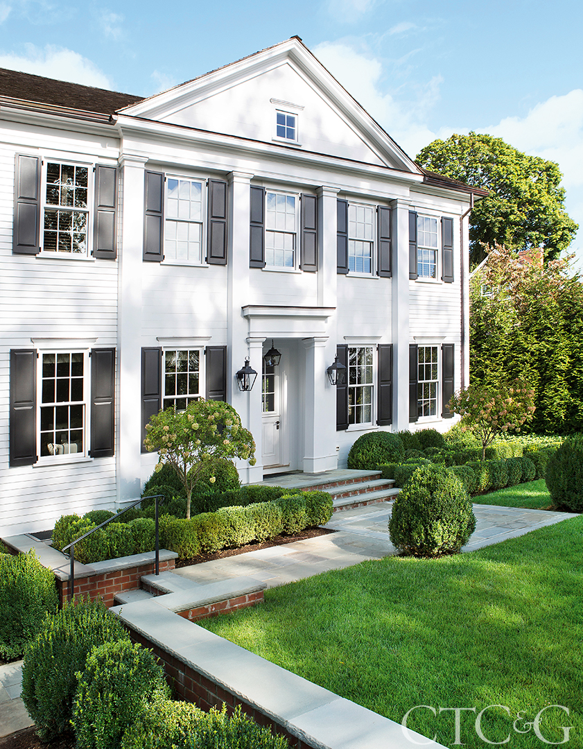 Landscape architect Janice Parker introduced pruned boxwoods and other stylized plantings in keeping with the home’s traditional Colonial façade.