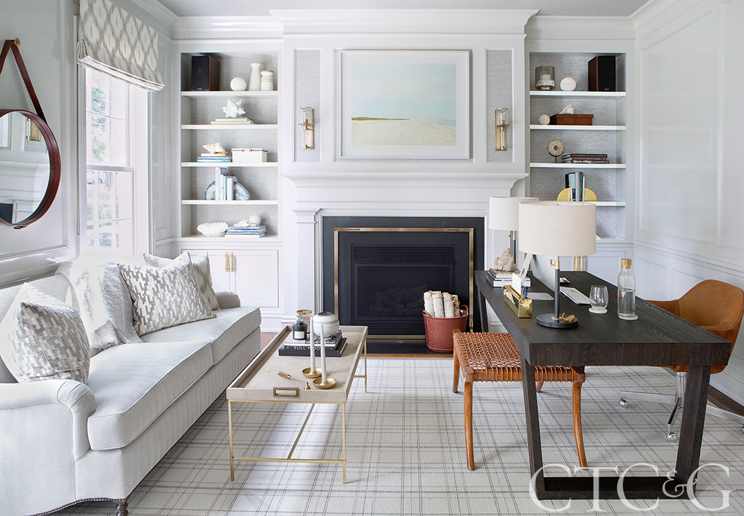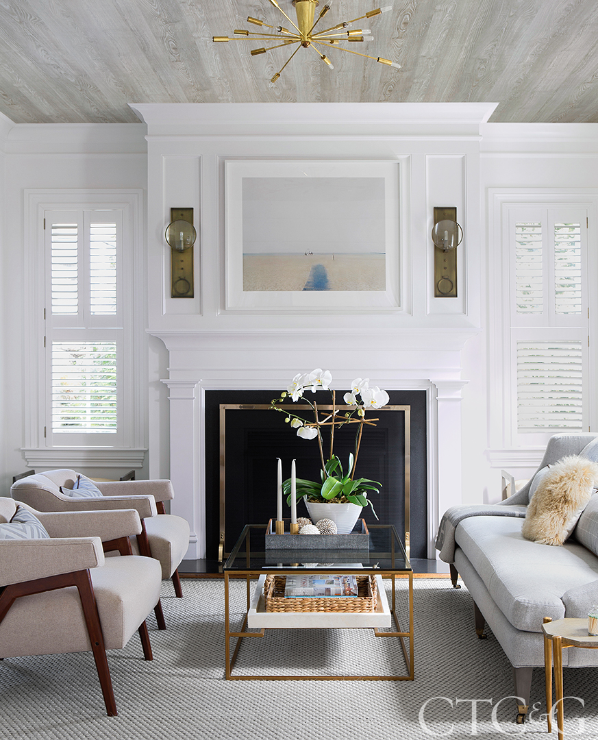 In the living room, designer John Bjørnen went a little more contemporary with a custom Lee Industries Landau Devan sofa through Fishers Home Furnishings, channeled armchairs sporting Robert Allen fabric from Greenwich Living Antiques & Design Centre, and a brass and glass cocktail table and shagreen-topped side table both through Lillian August. The sputnik chandelier is from 1stdibs; Urban Electric sconces are through La Luz.