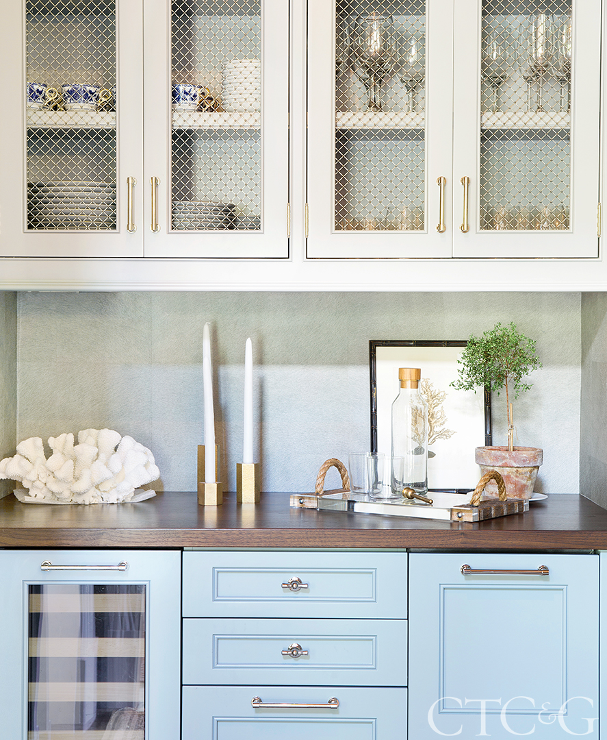 The new butler’s pantry has custom cabinets by Murphy Brothers Contracting that sport Waterworks hardware.