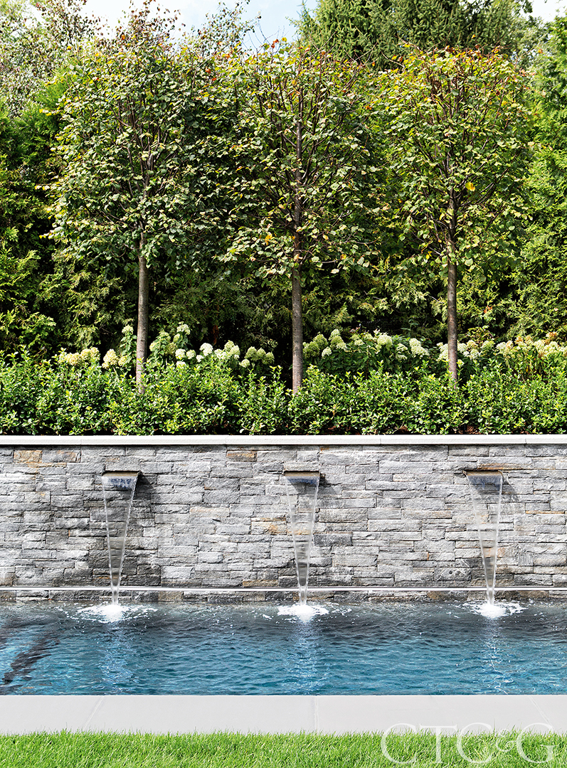 Janice Parker included a trio of scuppers on the stone wall that lines the pool to create a water feature and a spa-like atmosphere.