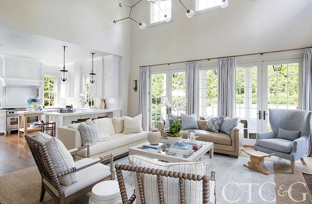A classic leather sofa from Lillian August plays off the traditional Hickory White bobbin chairs in the high-ceilinged family room. A second sofa wearing Kravet fabric is through NY Custom Furnishings.
