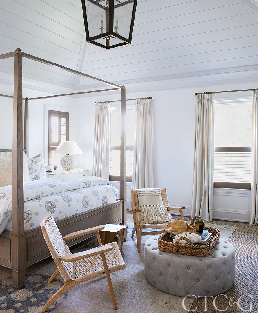 An oversized walnut and brass La Luz lantern warms the vaulted ceiling above a four-poster bed from Lillian August, while table lamps from Bungalow top bedside tables through Made Goods. A Marc Phillips wool rug is layered over a sisal also through Lillian August.