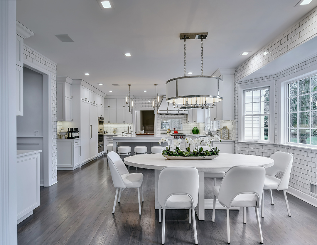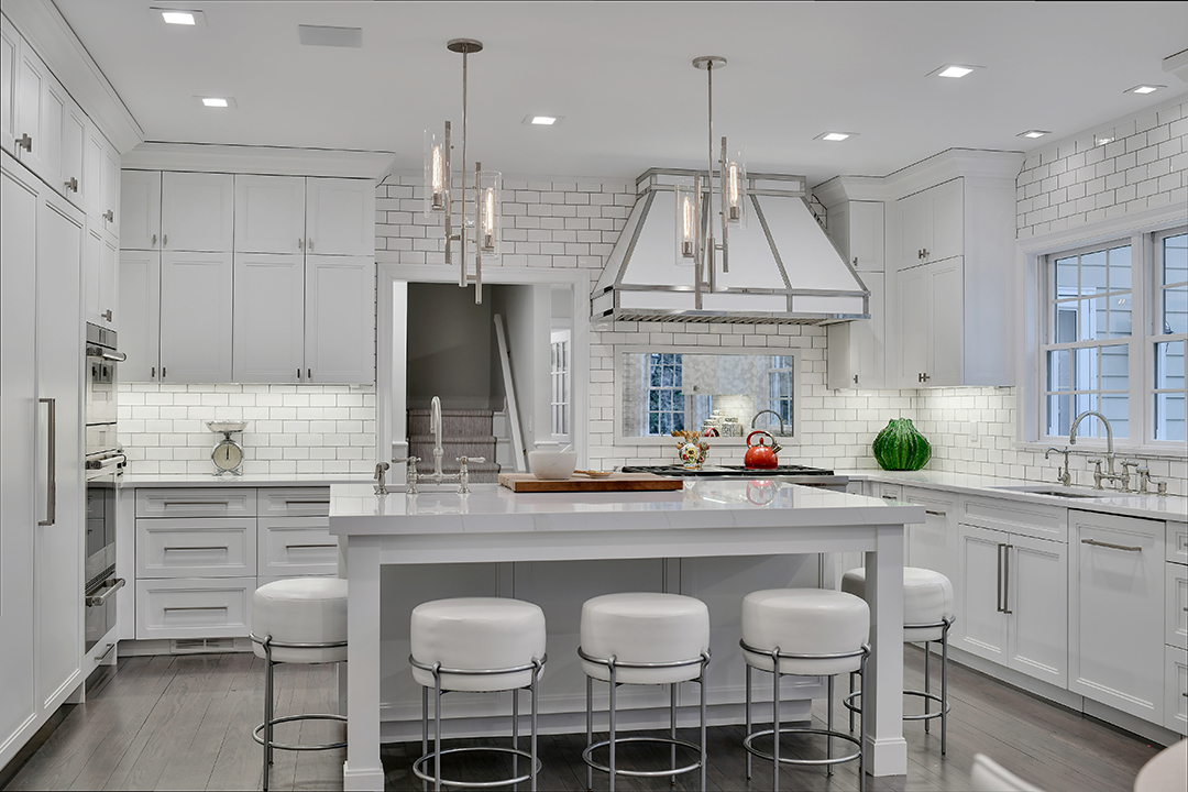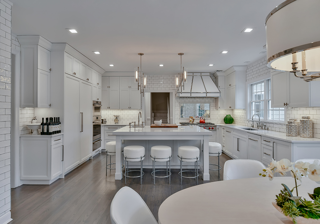 The kitchen is the heart of the home for many people, and that is certainly the case for this family, too. Baltimore aimed for a classic and light feel with all-white cabinetry and subway tiles, while also adding subtle sparkle. Metallic accents make the unique range hood pop, while the pendant lights truly act as that final touch of jewelry that ties together the room.