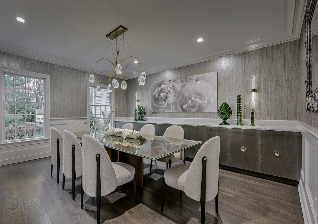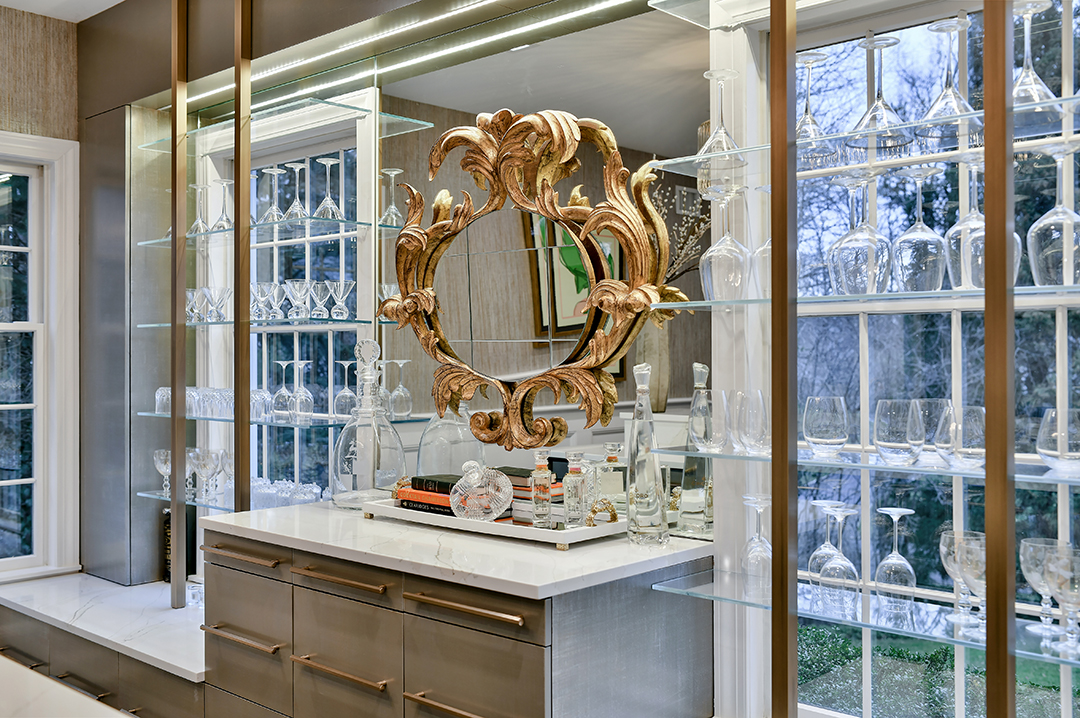 The formal dining room and the wet bar both exude panache thanks to their eye-catching light fixtures and mix of metals. Boasting an ornate mirror and walls of floating shelves for displaying glassware, the bar is especially glamorous. During Friday happy hours or birthday cocktail parties, the homeowners may have trouble getting guests to leave this spot as it truly feels like being served at a sophisticated hotel lounge.