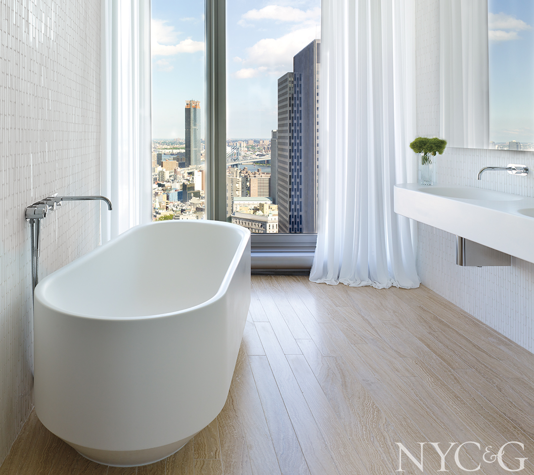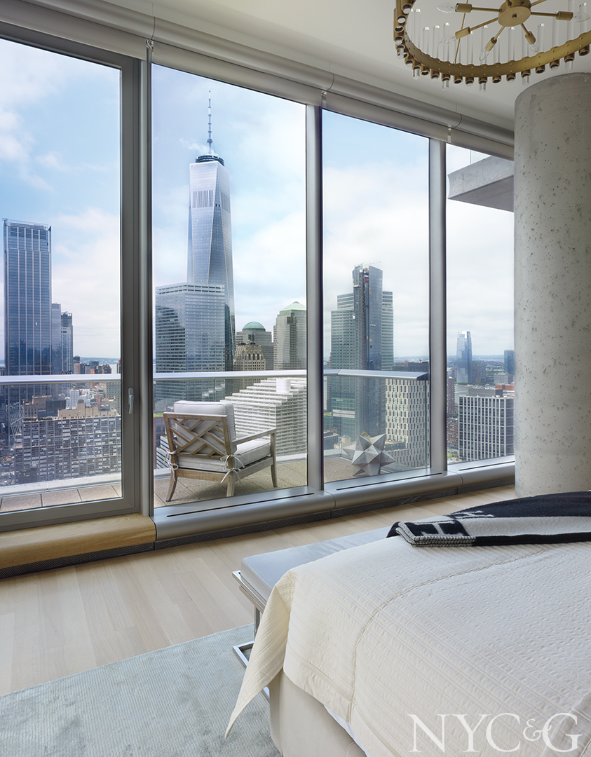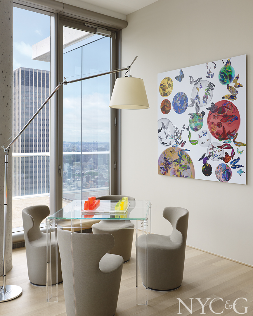 The baths and kitchen—where a sculptural high-gloss black lacquer island topped with black granite is set against reflective satin-etched glass cabinetry—had been expertly conceived by Herzog & de Meuron and didn’t require any further effort, although Delrose installed a couple of shower doors where there were none and punched up the powder room with a quartz-motif wall covering from Phillip Jeffries. But his most critical contribution to the apartment is probably one that most people don’t notice: In order to play up the glass-box setting and maximize the views, Delrose had Lutron install motorized shades throughout the apartment that disappear at the push of a button. “We didn’t want to start hanging heavy curtain rods and draperies,” he says, “so this was a functional solution.” The result is a space that allows the building’s architecture and dramatic vistas to take center stage, while providing an option for privacy and minimizing sun glare. “Who wants to compete with the city, anyway?” says Delrose. “Unless I put the Mona Lisa on the wall, no one was going to look at anything else.”
