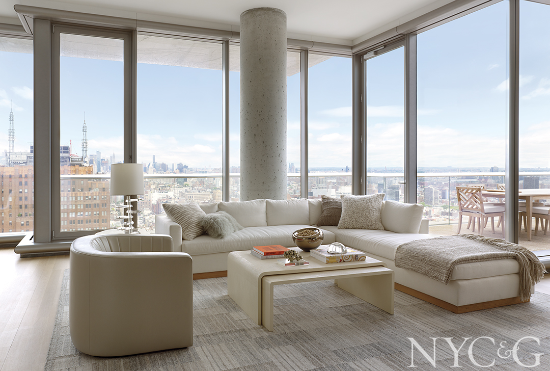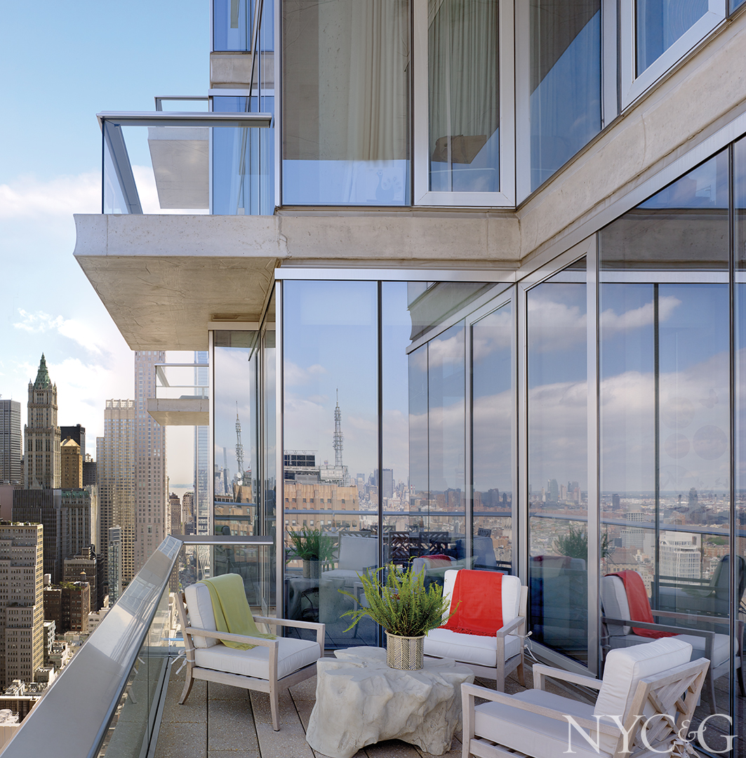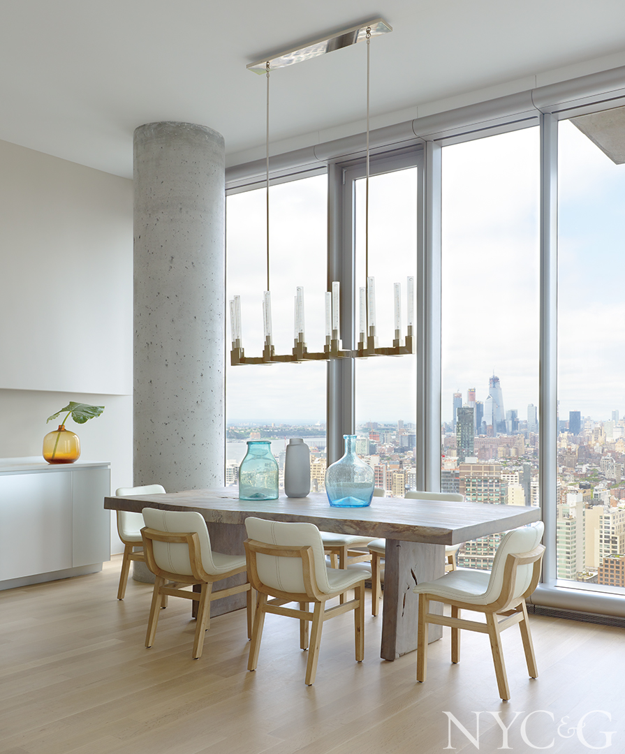 In a full-court press to meet his deadline, Delrose snapped up furnishings, and even some floor samples, from vendors such as Stark, Homenature, Holly Hunt, Ralph Lauren Home, ABC Carpet & Home, and B&B Italia, mostly in neutral tones. “Because the views are the star of the place—from the Statue of Liberty to the Brooklyn Bridge to One World Trade Center—it didn’t need a lot of color,” he says. “And I wanted my clients to have a quiet respite in the city.” Intentionally not too precious, the family-friendly scheme is heavy on durable materials like wood, Lucite, leather, cotton, and treated linen, as well as teak, the primary component of the furnishings on the apartment’s two outdoor terraces. “Because they have kids and dogs, everything needed to be indestructible.”