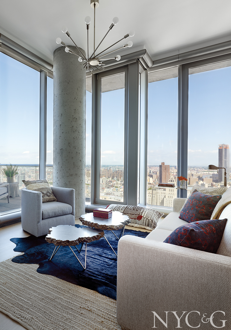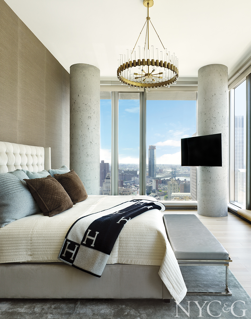 Closer to home, he was recently commissioned to decorate a young family’s pied-à-terre at 56 Leonard in Tribeca. Completed by Herzog & de Meuron last year, the 60-story Jenga-like skyscraper houses 145 condos, a lap pool, a sun deck, a theater, and a steam room, plus a soon-to-be-installed Anish Kapoor sculpture at its base. Delrose’s clients, who reside full-time in Naples, Florida, purchased the 2,650-square-foot three-bedroom as a crash pad and a place to entertain friends while visiting New York. “When a friend of my clients told me that she had recommended me for the job, I had no idea it was a unit in this building,” Delrose recounts. “They hired me over the phone and then said that they wanted to move in by Thanksgiving—which gave me only 45 days. I immediately started hunting for furniture that was in stock.”