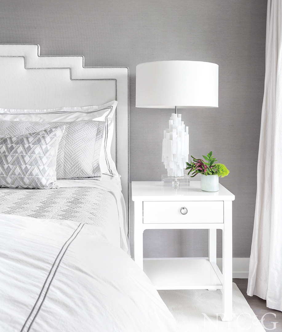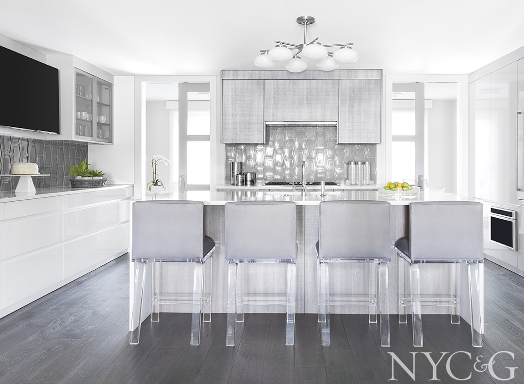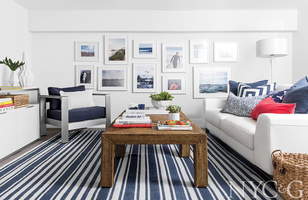 The pared down, modern decor on the second and third floors features lots of Lucite, textured accents, and pops of blue that amplify the water views outside. “When you sit at the kitchen barstools and gaze out at the water on a sunny day,” says Tutun, “it can really change your outlook. There’s something so therapeutic about it.”