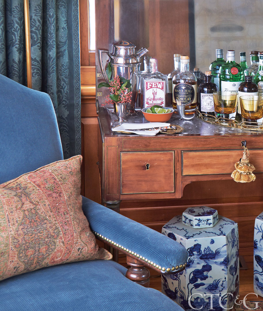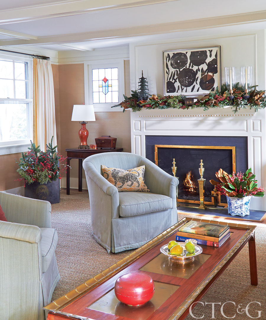 In the living room, seasonal greens and berries fill a vintage tea canister and jardinière; a midcentury tray table is from Hiden Galleries; chairs are upholstered in a Cowtan & Tout fabric.