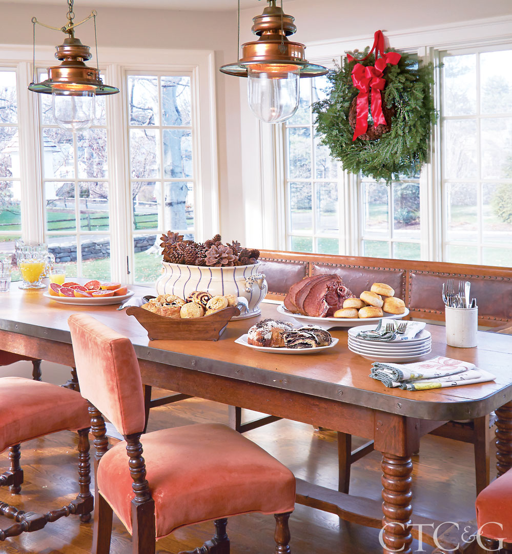 A classic wreath hangs above the bench in the breakfast room, where side chairs sport vintage velvet. The trestle table is from Yellow Monkey Antiques.