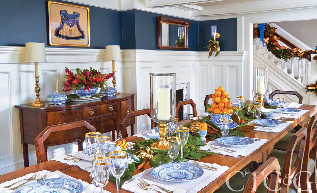 This festive table starts with natural decorations, a citrus topiary and clove-studded Meyer lemon pomanders. The 18th-century French walnut banquet table and framed textile of a Chinese child’s garment are from the Hamptons Antique Galleries; dining chairs, sideboard, hurricanes and lamps are from Harbor View Antiques; and the sconce is by Vaughan Designs.