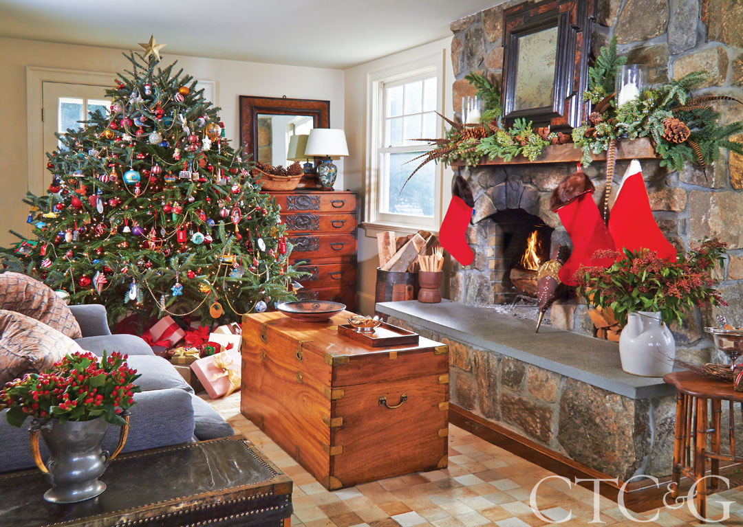 A lavishly decorated tree is the focal point of the family room, where a wood trunk from Antique and Artisan Gallery serves as the coffee table. The sofa is covered in a Rogers & Goffigon fabric.