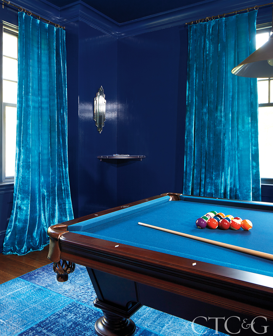 In the pool room on the first floor, Scalo has created yet another experience. “People want to use their homes in the way they are really going to live in them,” she says. “This could have been used in a more traditional way, but we turned it into a pool room. It’s a sharp contrast from the rest of the house and has a different energy.” Scalo took a nod from the pop of teal in the living room and turned it up to maximum voltage. Curtain panels in a silk velvet teal from her own fabric line drape over Phillip Jeffries navy lacquered strié wallcovering. A custom rug in various shades of electric blue covers the floor. “Silk velvet is dreamy,” says Scalo. “But would I use it on a chair? Not even if you begged me. Most of my homes are for families with dogs and cats, and I know what products to use where. It’s about creating environments that are livable, but also have a wow factor. Interior design is about more than just shopping and throwing objects in a room. My job is to inspire. That’s what I am good at.”
