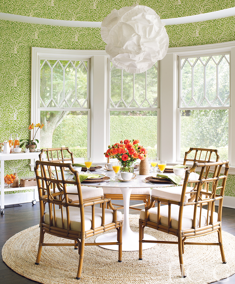 Jute plays an equally important role in the circular breakfast room, where a floral green wallpaper spans the length of the wall, accentuating the natural greenery outdoors, visible from ample windows. In the library, more jute and materials such as brass, steel, and stone add sparkle and warmth, alongside a pair of vintage rosewood chairs with cushy goat-hair upholstery and a Harrison–Van Horn cocktail table.