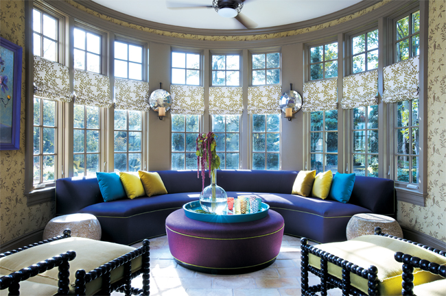 Sunny Delight | The sunroom fills the first floor of one of the turrets. Hines Bird wallpaper complements the sofa covered in violet Holly Hunt fabric. Pillows are Elitis through Donghia. The custom round ottoman is through Interiors Haberdashery. The chair fabric is Rogers & Goffigon. The Galbraith & Paul shade fabric is through Holland & Sherry.