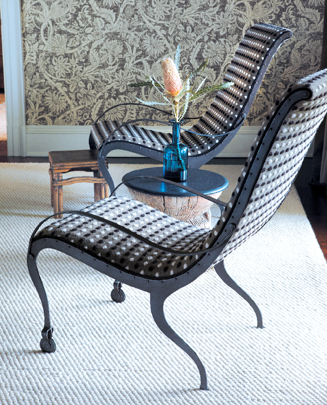 Master Class | Sculptural metal chairs through Lynn Scalo are covered in a textural wool fabric.