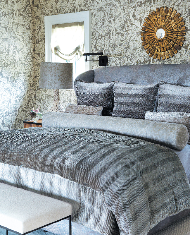 Master Class | The upholstered bed in the master bedroom is from Restoration Hardware and features ample wings, above which are glass-and-steel reading sconces from Holly Hunt, set against a garden-motif wallpaper by Peter Fasano Egerton. Both the lampshade and bolster fabric are by Fortuny.