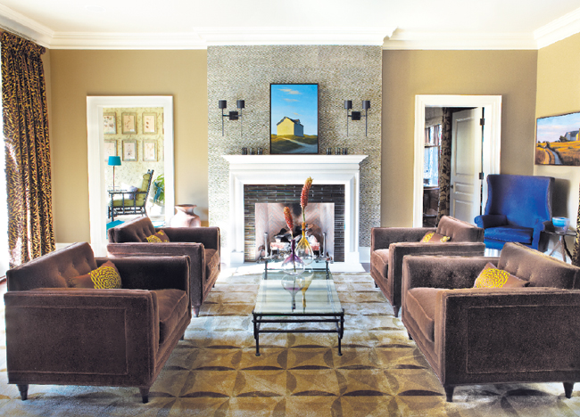 Flawless Finish | The living room was designed with four Baker chairs (and no sofa) positioned around a John Rosselli glass coffee table atop a custom Stark rug. The fireplace wall is wrapped in a rattlesnake-motif Edelman leather. Holly Hunt sconces flank a painting by Joan Albaugh.