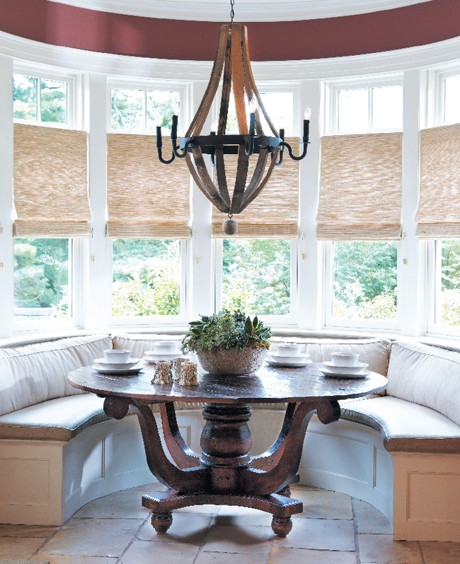 Morning Meeting | Place An inviting breakfast nook fills another one of the house’s turrets. The banquette is covered in a fabric by Rose Tarlow. Window shades are through Conrad Imports; light fixture is through Circa Antiques.