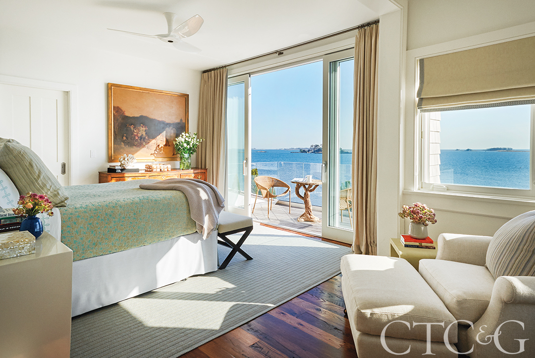 A Boffi ceiling fan draws Sound breezes into the master bedroom, where a bed from Peruvian Touch is dressed in Matouk sheets and finished with a Serena & Lily blanket. The linen-and-wool rug is from the Mitchell Denburg Collection. The Viyet chair and ottoman wear a Rogers & Goffigon fabric.