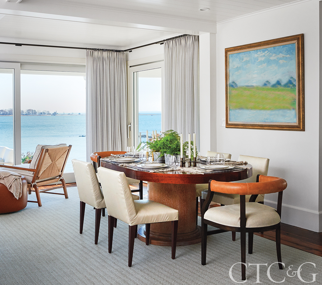 A dining table from Balsamo Antiques is surrounded by Kirby chairs through Foley & Cox and head chairs from Lucca Antiques. A window-facing pair of rush armchairs and a leather ottoman are from Hickory Chair.