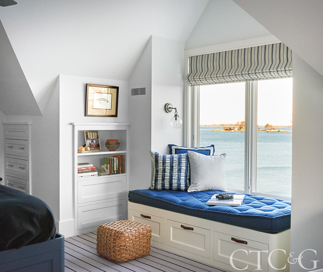 Watch the world sail by from the window bench by Artistic Upholstery in a David Sutherland canvas. Pillows are from L’aviva Home’s Burkina Collection and in a Perennials canvas weave.