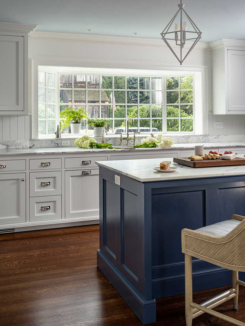 “We gained an entire wall of storage by utilizing space from these closets behind the kitchen. We also designed and added the bay window, which I knew would make the kitchen feel so much larger,” the designer recalls.