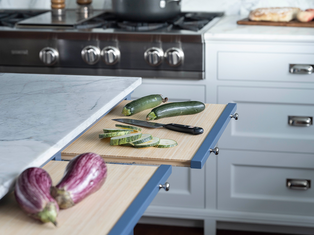 Looking to elevate the kitchen’s beauty and sense of history as well, Sarah added cutting boards to the top rail of the cabinets. The designer knew this was a typical detail seen in millwork in the early part of the 20th-century.