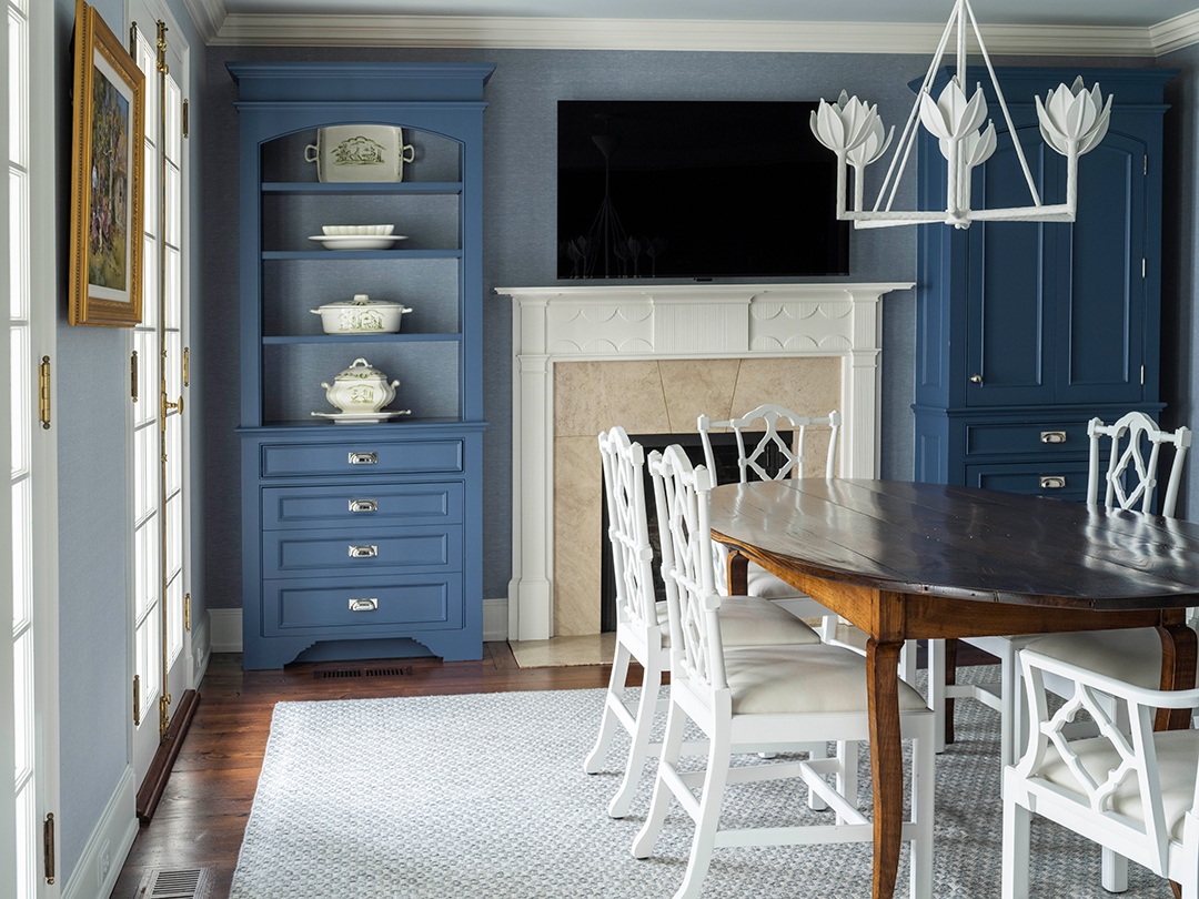 Sarah painted the existing cabinets and fireplace surround, reupholstered her client’s chairs, and kept their antique table—respecting the room’s aesthetic while giving it a fresh feel. When it came to additions, she brought in a performance fabric rug and blue Phillip Jeffries Grass Cloth wallpaper to soften the space, but her most substantial upgrade involved boosting functionality yet again. Sarah designed a custom built-in to hold under-counter fridge drawers, a wine unit, and additional dish storage.