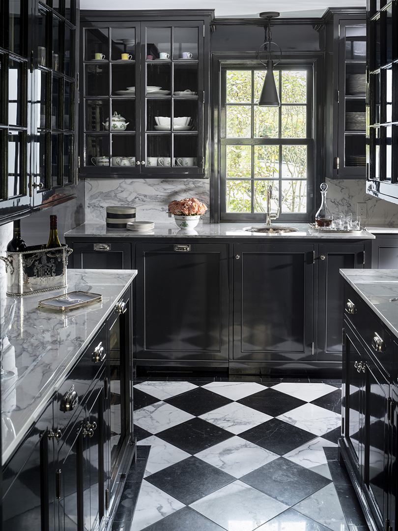 Sarah’s penchant for classicism and gift for bringing out the best in a space peaks in the surprising butler’s pantry. Inspired by its stunning black and white marble flooring, she kept the original cabinets but gave them a bold facelift with high-gloss black paint. This formalized and preserved the room, while also giving it some moody edge.