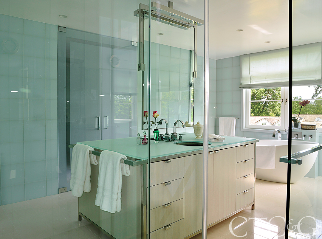 A bleached-wood vanity with a frosted glass countertop is a modern upgrade in the master bathroom, where the sink faucets are from Newport Brass and the tub is Waterworks.