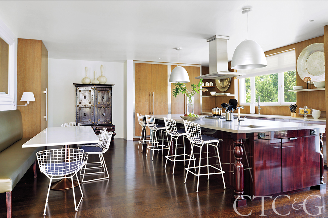 In the kitchen, a brass-trimmed cabinet from Sri Lanka is juxtaposed with Bertoia counter stools and chairs from Knoll. Wolf’s masterful merging continues with Artemide pendants lighting the high gloss mahogany island with a custom concrete top. The dining table is topped with Pental quartz.