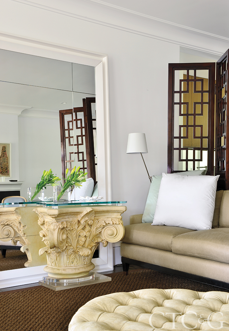 A circa 1970 Corinthian capital turned table makes a strong contemporary statement in the living room where a VW Home sofa touts a VW Dunes Toast fabric, and the sisal rug is from Fox Floors.