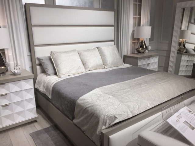“Throughout the showrooms, I loved the channeled upholstered beds—the clean lines and modern detailing. I saw the channeling used both horizontally and vertically.” – Patty Carmody of Patty Carmody Interiors, Upholstered bed pictured is by Bernhardt Furniture.