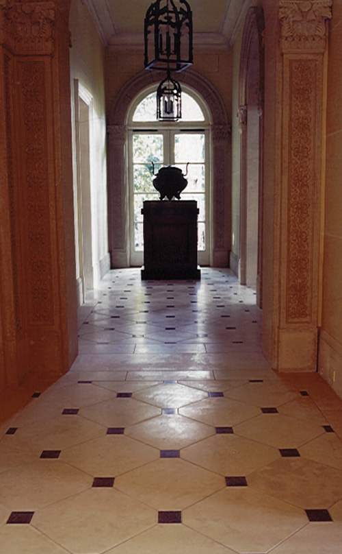 Paris Ceramics donated the stone floor and vanity top in the guest cottage powder room. These materials were selected to complement Schumacher’s Manor Gate wall covering. The White Bulgarian limestone is a very clean, consistent material, often used with a contrasting colored cabochon. The company is well known for sourcing and selling reclaimed antique floors, a tradition that led them to extend their range of products to include newly quarried limestone, marble and other unique stones that are exclusive to them. In addition, Paris Ceramics has the ability to create unique materials through distressing, color-washing, fabricating and finishing. They also offer a full range of hand-cut, hand-glazed/painted decorative tiles and and custom mosaics of every description, in addition to wood flooring. parisceramicsusa.com