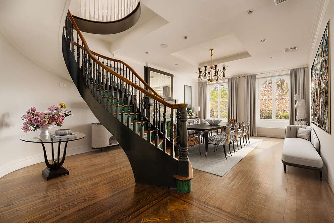However, potential buyers may mainly be impressed by the six-bedroom abode’s great architectural bones. Curving staircases, arched windows and doorways, ornate fireplaces, and soaring high ceilings are all part of the deal here. The townhouse also has a lovely garden to enjoy as well as perks like a media/screening room, Art Deco-esque elevator, and a grand primary suite closet.