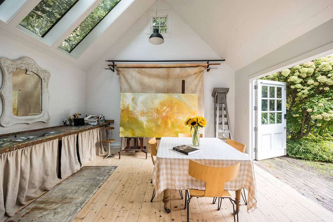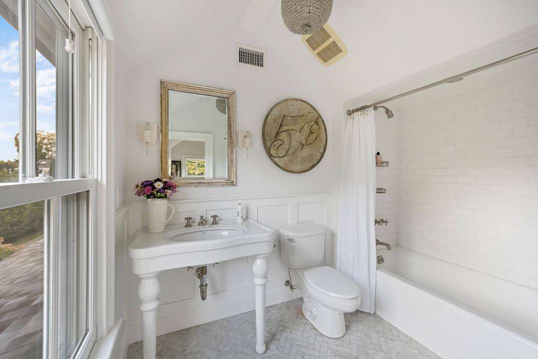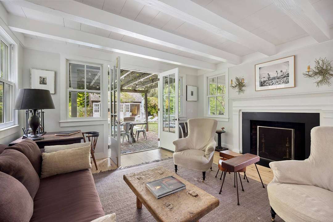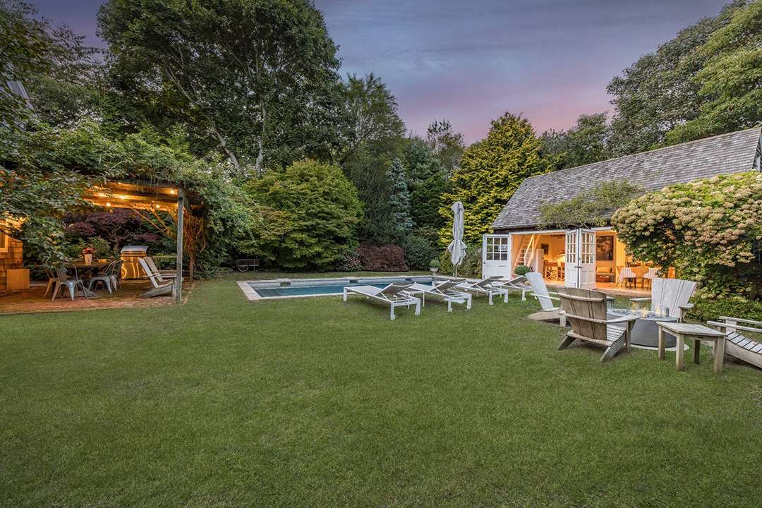 Tucked quietly behind a gated private driveway in the coveted Amagansett Lanes, the home serves up evergreen elegance and cottagecore coziness. That starts with its brown shingled exterior and classic front porch, then continues in through the white interiors with wood details, fireplaces, and Dutch doors that open to a pool, pergola, and accompanying detached structure. It can be used as an artist’s haven, hobby studio, small party barn, or an extra living space for poolside gathering.