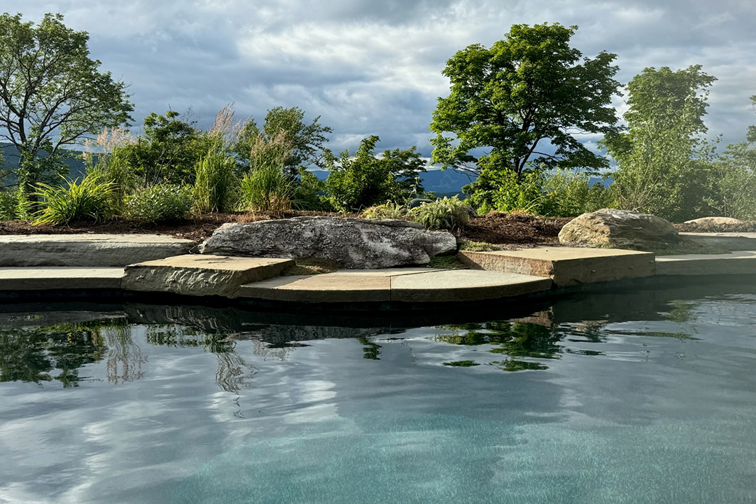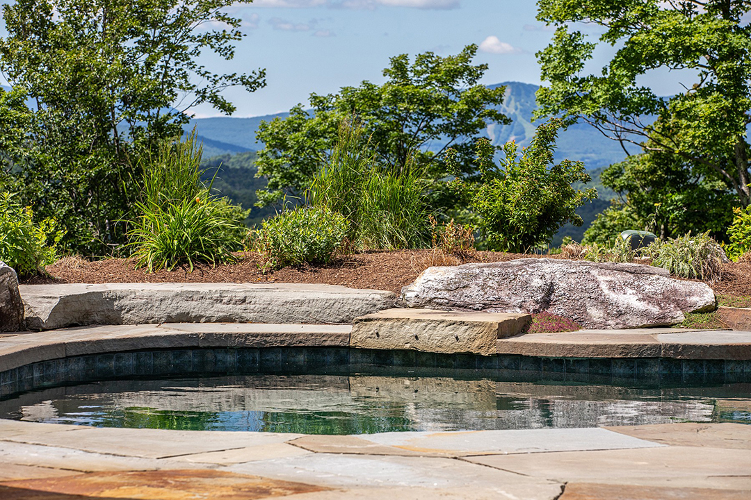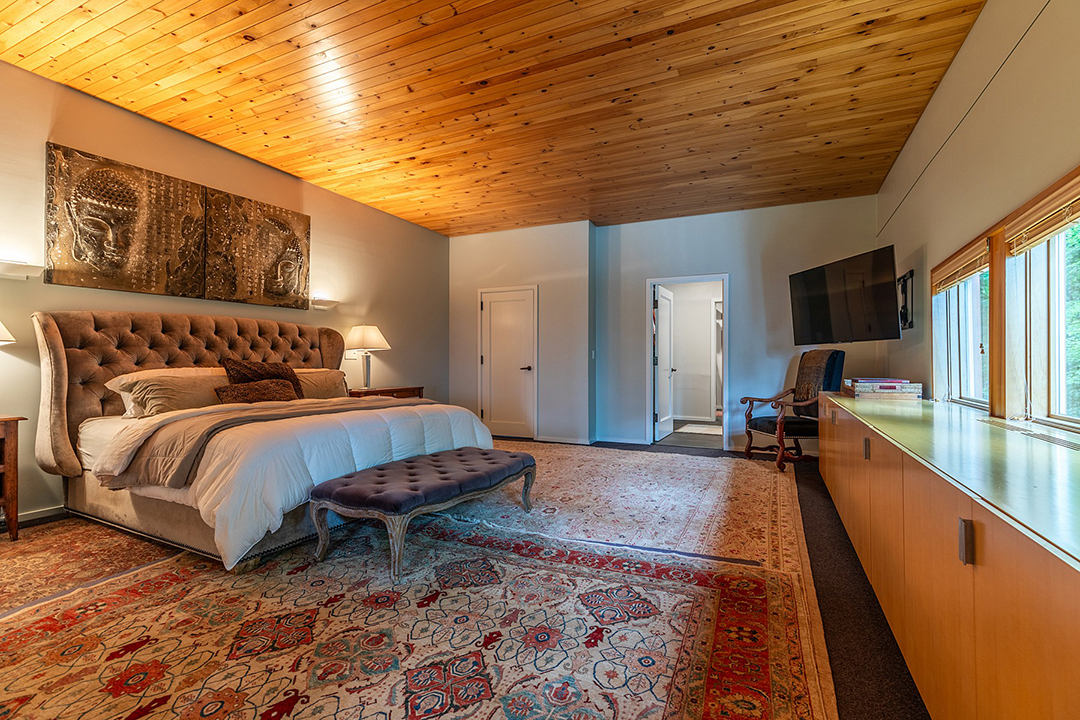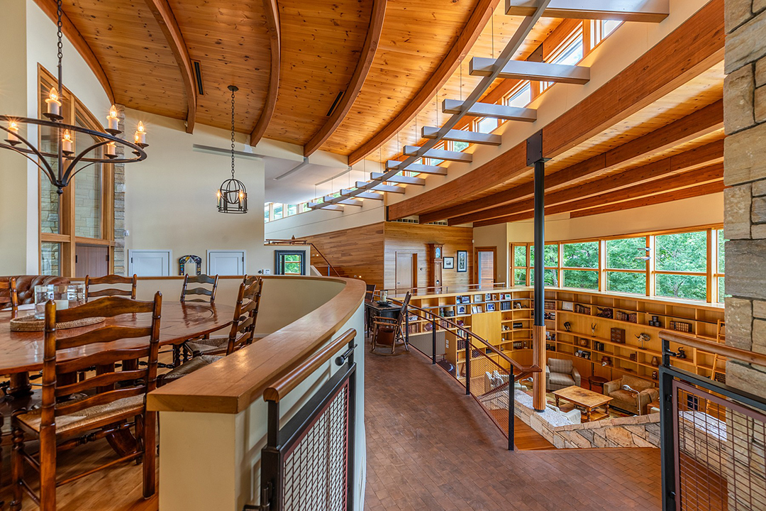 Defined by its curving shape and bold use of wood, stone, and glass, the residence looks like it may have been designed in the 1960s or 1970s when it was only built in 2005. The great room is most astounding in its design and scale. There are many different areas to lounge, from the library to the seating in front of the 18-foot stone fireplace. All with a vast wall of glass displaying panoramic views and a dramatic show of New England’s seasons.