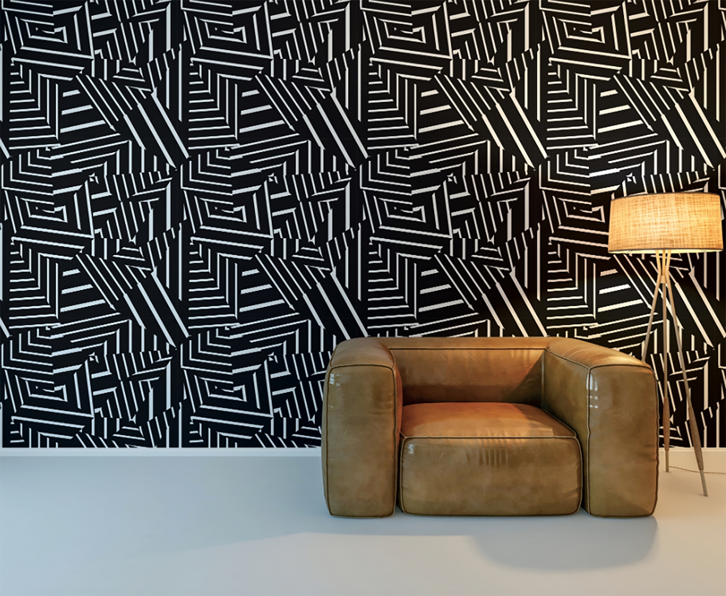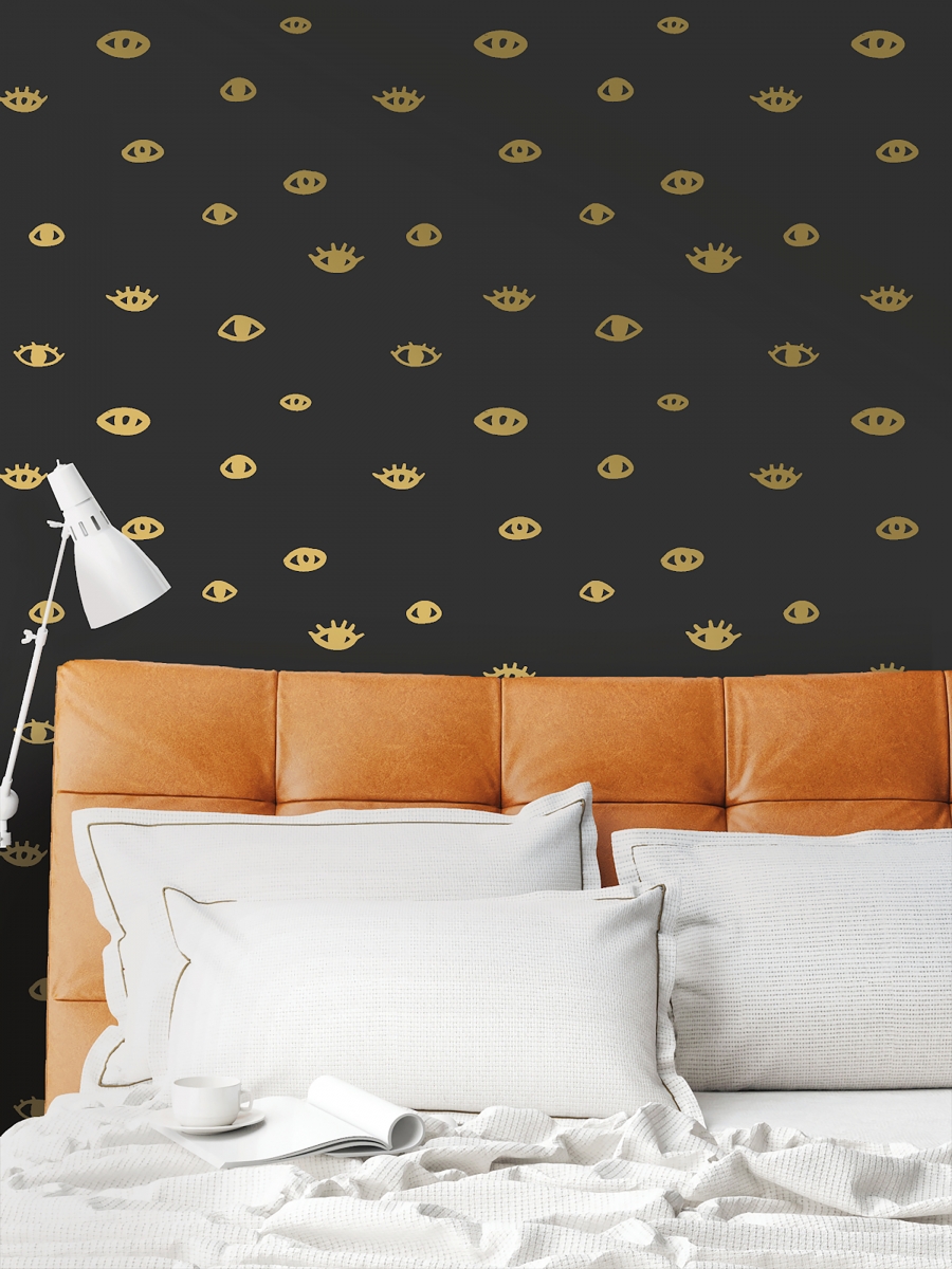 There are five patterns in the Tempaper line. Dazzle is a black and white design that mixes and matches fragmented patterns into a new arrangement of intersecting lines. Eye See You is available in black with gold and glossy black with white. It’s a series of hand-drawn eyes that together create a fun, modern print. Shift is also in black and white and features a series of sketched lines — sort of an unexpected take on typical stripes. Wiggle Room is a bold print of black brush strokes against a white backdrop. And Check You Out is a modern-day take on the traditional classic plaid pattern, done in a navy colorway. I wanted all of them to have a graphic element but done in a monochromatic way.