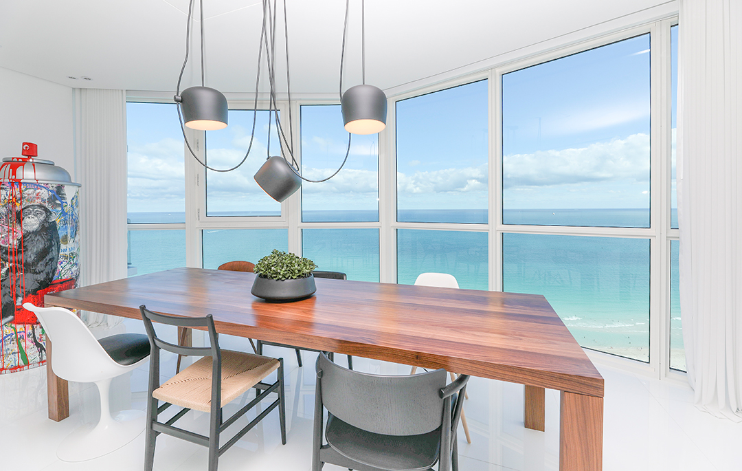 Perched on the 37th floor of the Setai Hotel and Residences, the 2,525-square-foot condo has evergreen appeal. Who wouldn’t love the floor-to-ceiling walls of glass that look out to the lively city and the turquoise Atlantic Ocean? Whether you’re lounging in one of the three bedrooms or entertaining in the open living spaces, captivating views are always in sight.