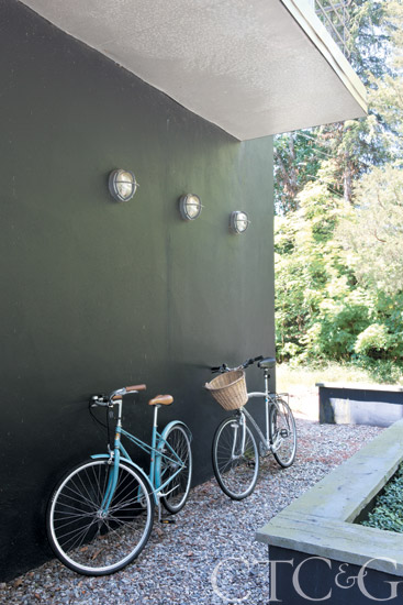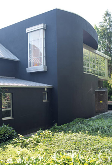 The dark charcoal structure, a mix of original carriage house, modern architecture and contemporary studio, trips down the Connecticut hillside.