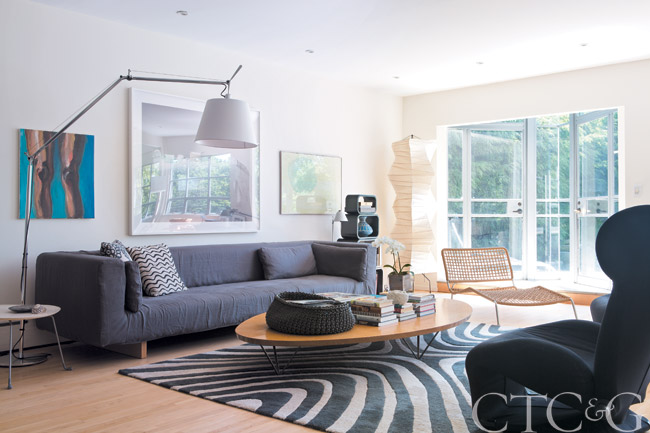 In the living room, a vintage sofa from the Conran Shop is flanked by Artemide and Noguchi lamps, facing a pair of Cassina chairs.