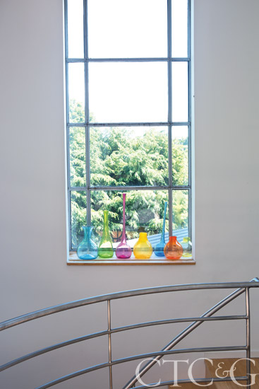 A perfectly striated window frames the view of the outdoors, while colored glass vases echo the complexity of color both outside and inside.